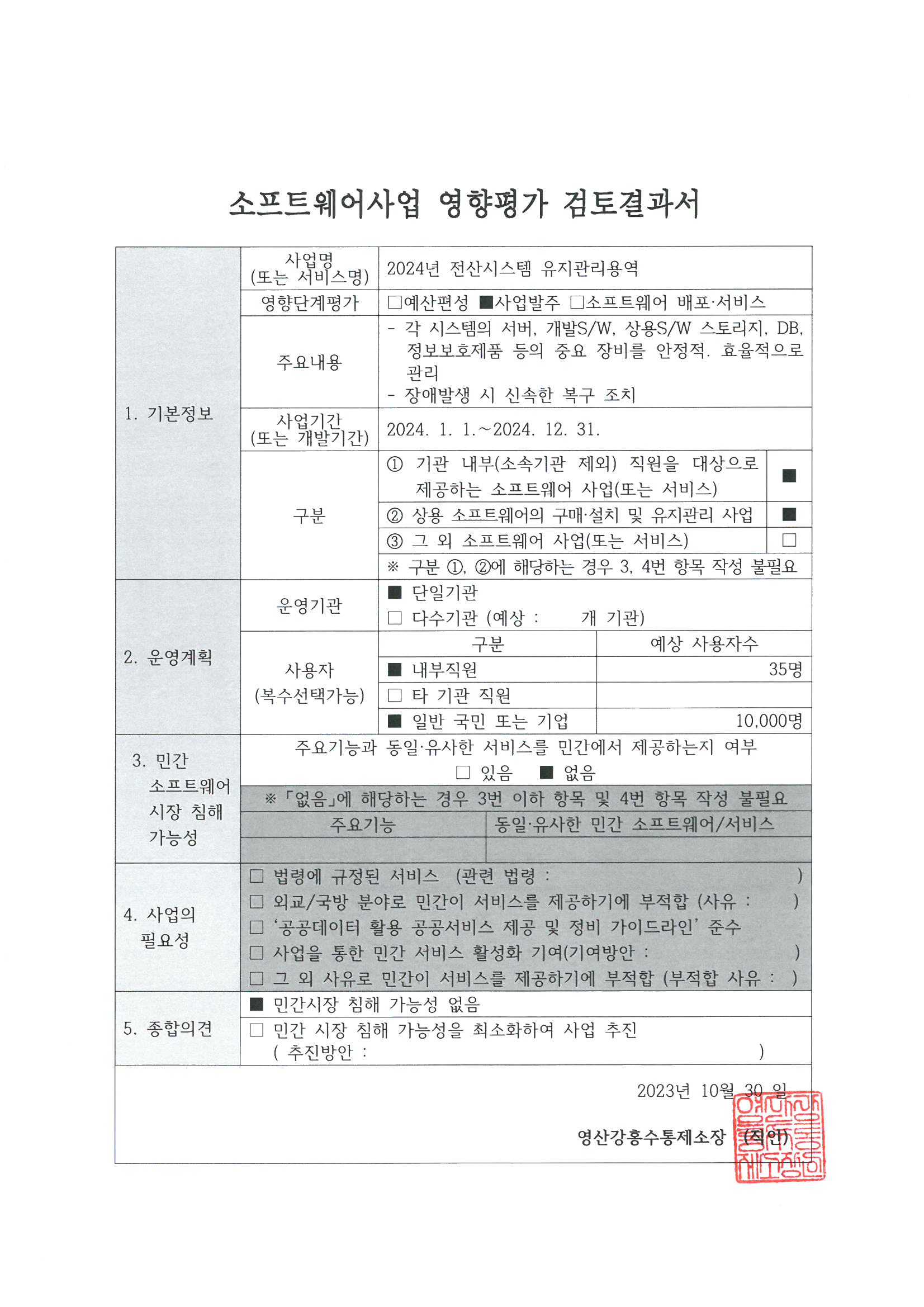 2024년 전산시스템 유지관리용역과 관련하여 소프트웨어사업 영향성평가를 실시하고 그 결과를 붙임과 같이 공지합니다.