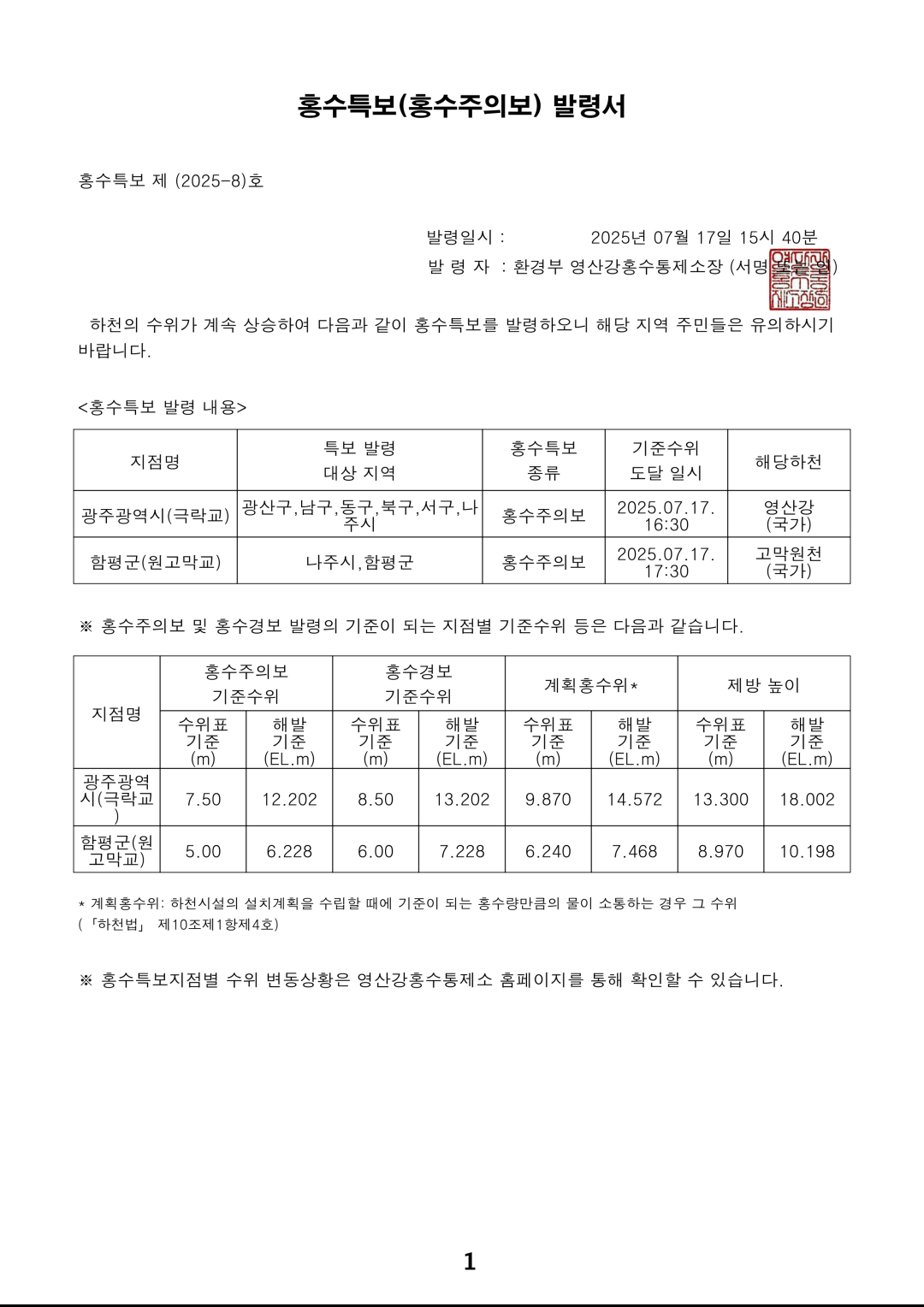 홍수특보 발령사항