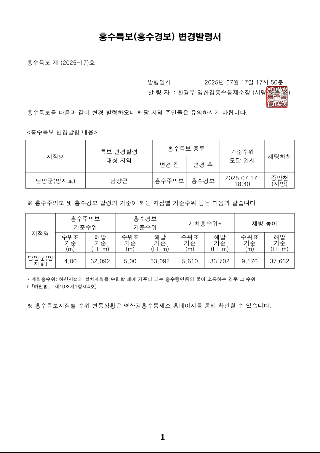 홍수특보 발령사항