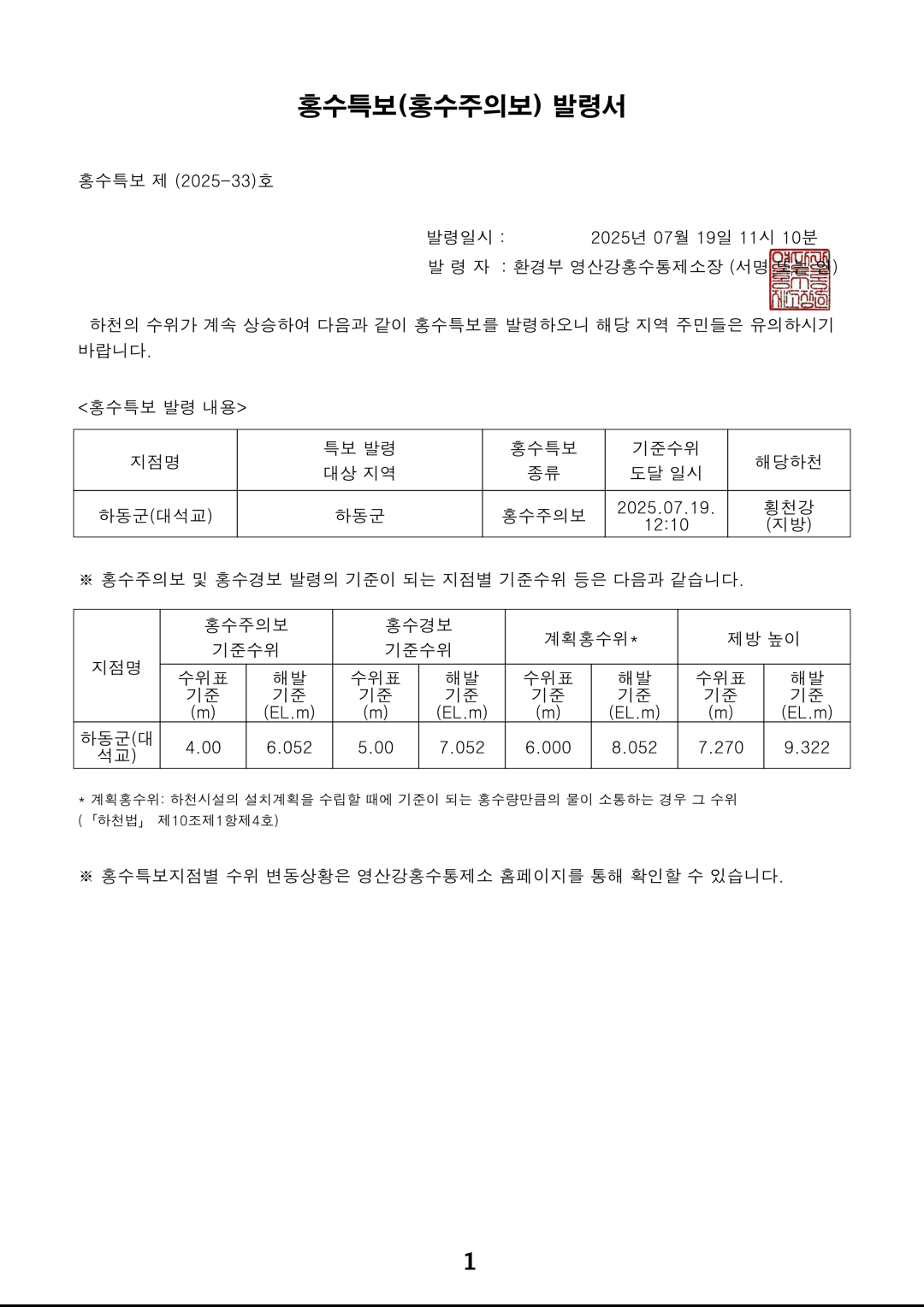 홍수특보 발령사항