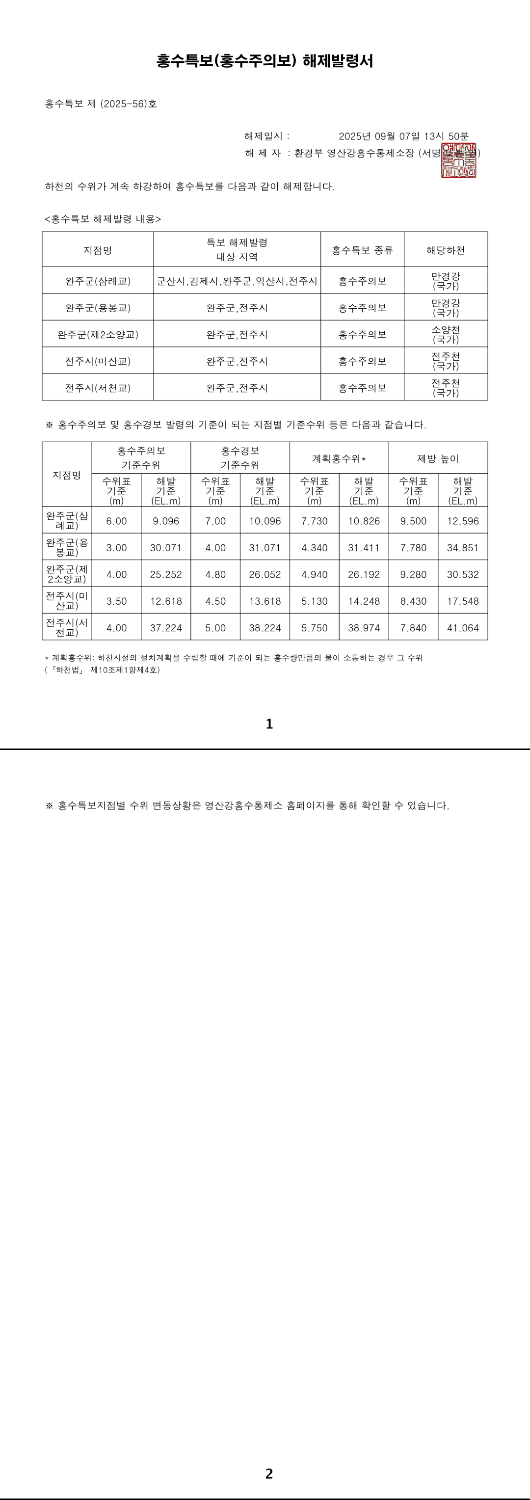 홍수특보 발령사항